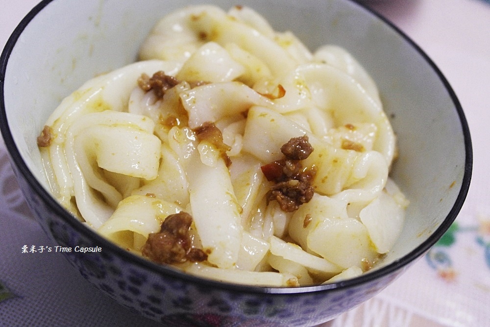 迷人的沙茶香經過攪拌,粄條沾附了沙茶肉燥香,