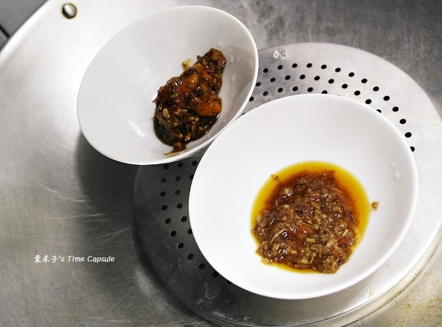 台灣肉燥醬包油較多,但較容易使粄條拌開來,