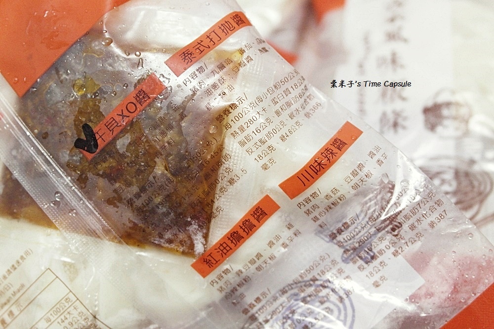 紅色的有干貝XO醬、泰式打拋醬、紅油擔擔醬、川味辣醬,