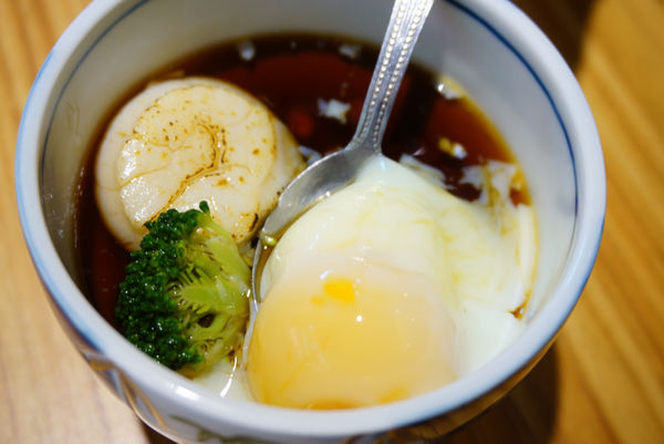 Q彈的生食級大干貝搭配著滑嫩的溫泉蛋,下方是特製的柴魚醬汁