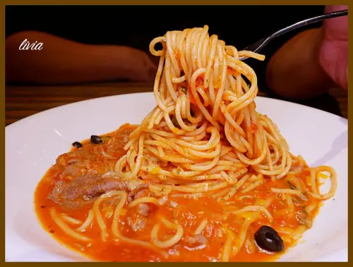另外日式明太子醬烤鮭魚佐法式薔薇醬汁義大利麵,對於軟硬度的剛剛好的義大利麵,