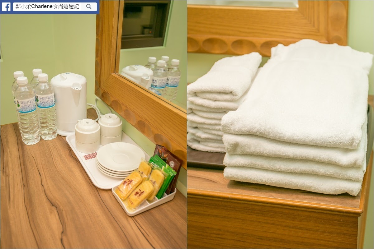 礦泉水、茶包、咖啡包、餅乾、電熱水壺、毛巾及浴巾。