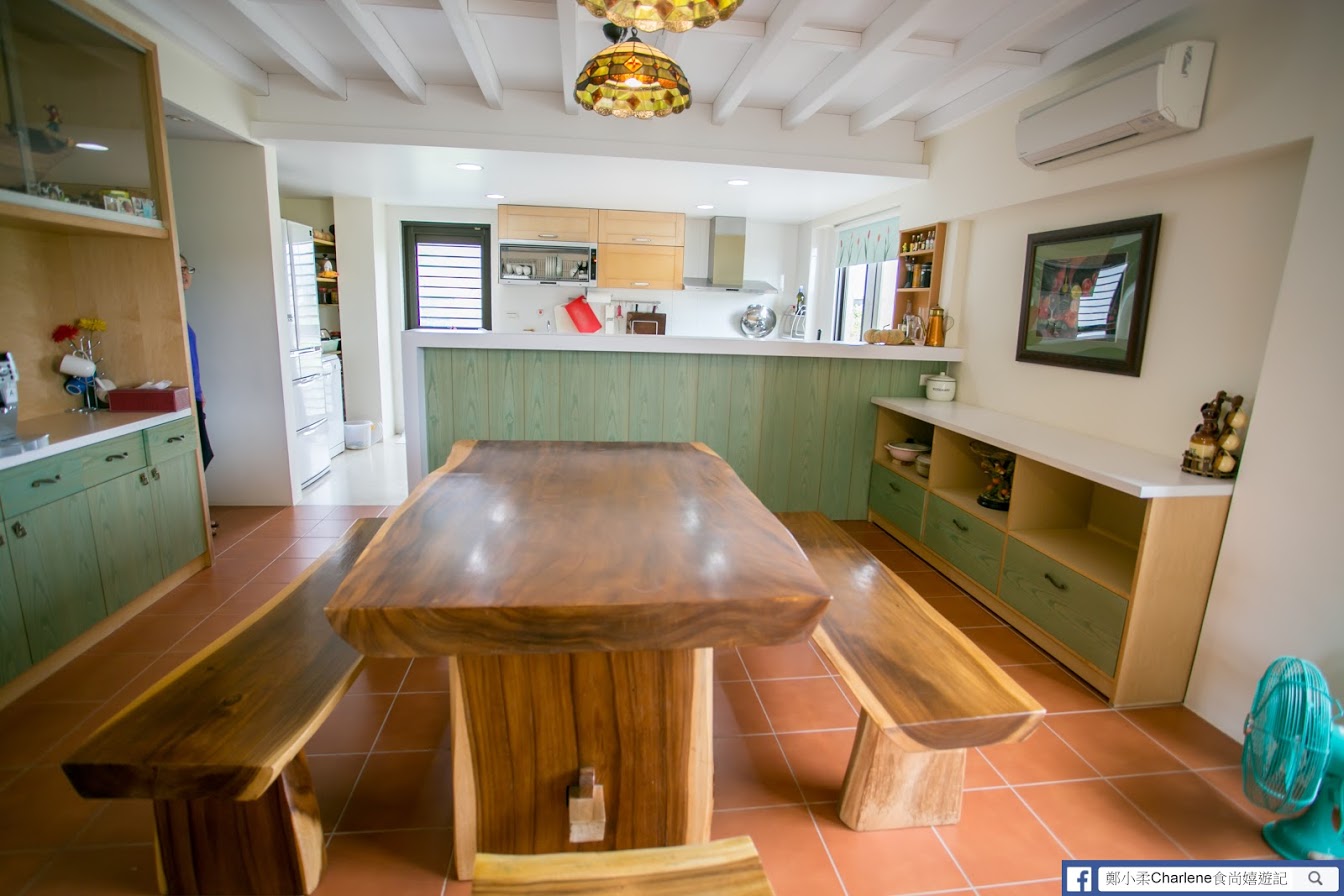 一樓也規劃了廚房,大量木質調、磚紅色地板裝潢呈現