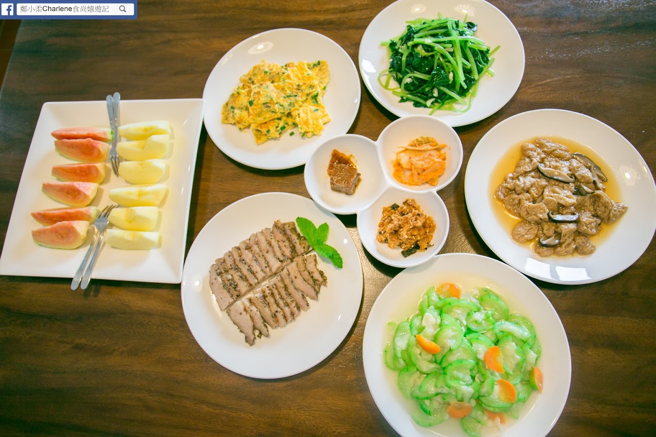 蔥蛋、地瓜葉、絲瓜、麵筋、豆腐乳、黃金泡菜、松阪豬等