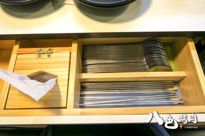 拉開抽屜有紙巾跟餐具