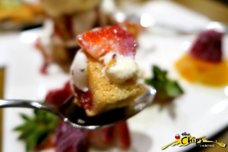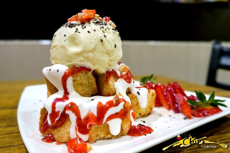 一旁還有搭配酸酸甜甜的新鮮草莓,可以中和嘴裡的甜膩感~
