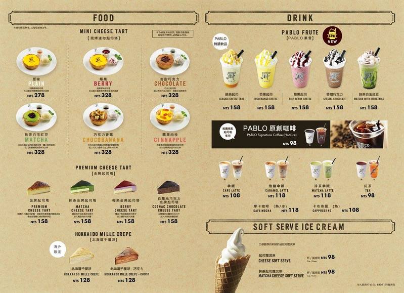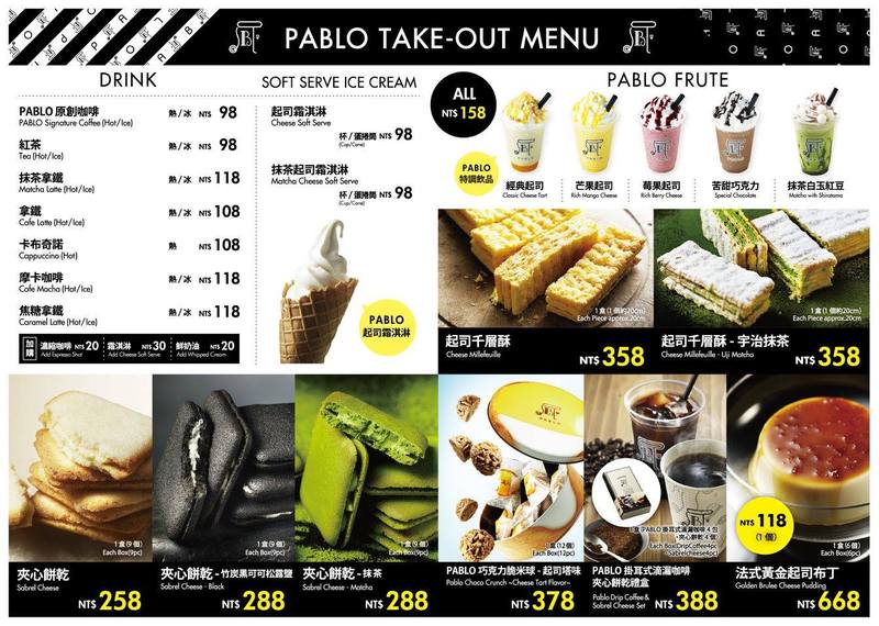 「PABLO果昔」以特選起司搭配新鮮食材現打製作,共有經典起司、芒果起司、莓果起司、苦甜巧克力及抹茶白玉紅豆五種口味,主打「drinkable cheese tart」,為台灣少見奇特口感