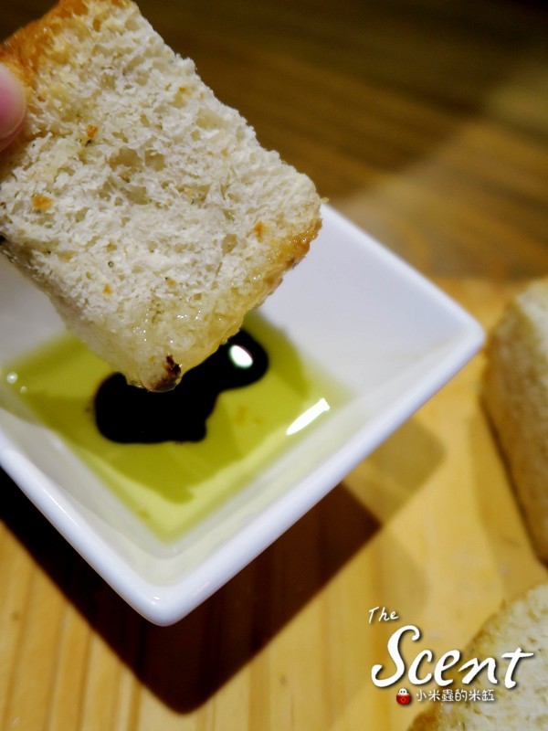 溫熱的佛卡夏麵包口感鬆軟帶有迷迭香,佐上橄欖油與紅酒醋,更顯味美~