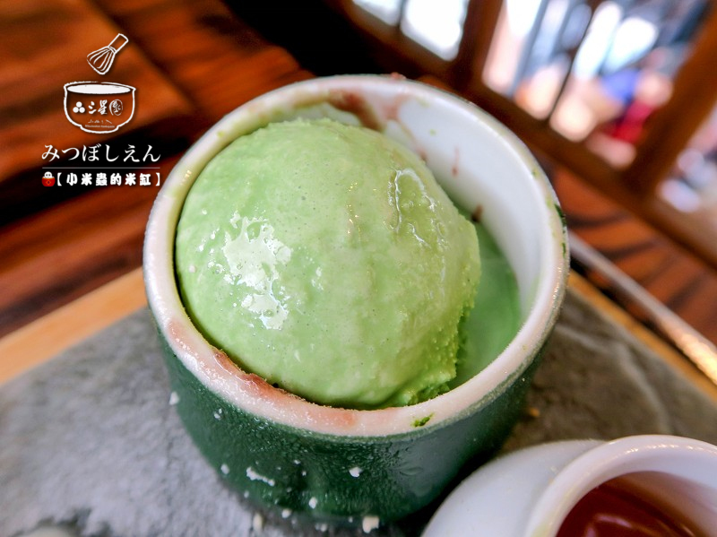 抹茶冰淇淋滋味濃厚微苦,與香甜的蜜紅豆搭配