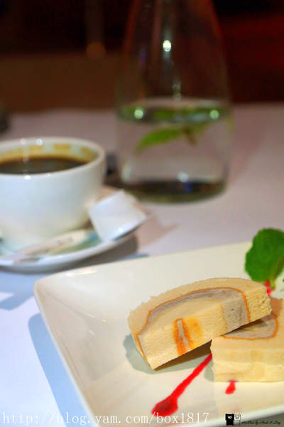 店家自製的甜點:芋泥捲,吃起來可以感覺芋頭的原味,不過蛋糕捲表現的就很普通,