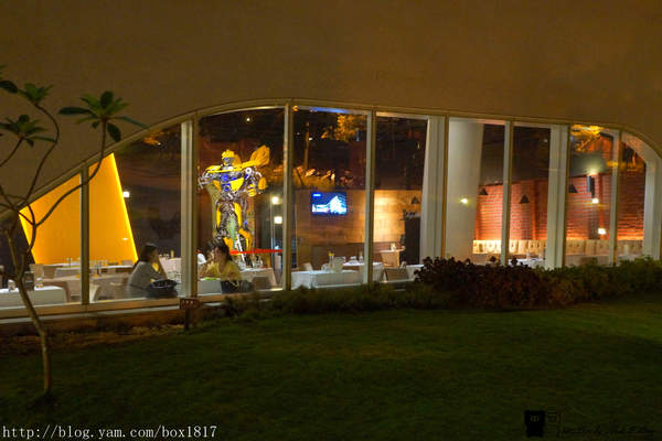 從戶外看進去一樓大黃蜂主題餐廳,大黃蜂超吸睛,