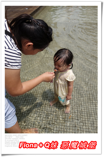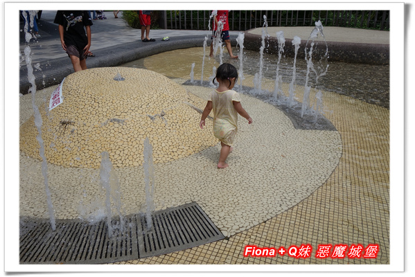 我們完成巧克力DIY作品,到樓下與老爸他們會合,此時Q妹已經在戶外的「親水池」玩瘋了,炎炎夏日真的好適合戲水呢 !