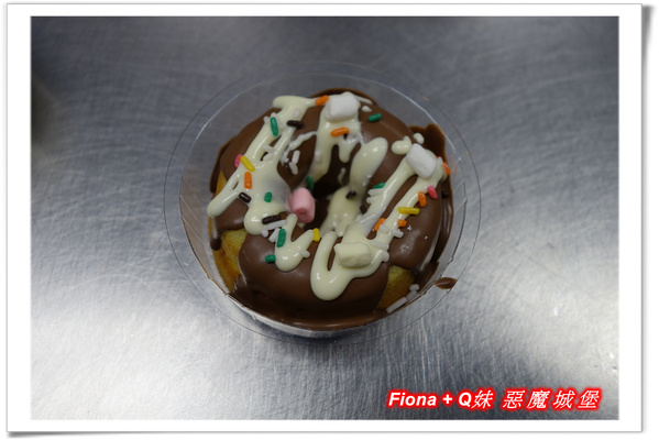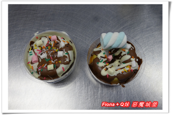 首先製作的是巧克力甜甜圈,將巧克力均勻倒在甜甜圈蛋糕上,再用另一色巧克力畫出條紋,最後灑上棉花糖跟彩色糖果碎片即完成,看起來有沒有像麵包店在販售的甜甜圈呢 ? 呵呵 !