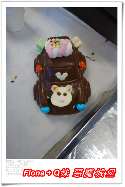 最後是巧克力汽車,其實它反而最簡單,只要將糖果裝飾品沾巧克力黏貼在車上即可,Fiona將車子裝飾的好可愛,整台車看起來超夢幻啊 !