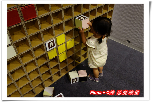 三樓展區角落還有一間另小朋友瘋狂的「趣味拼圖牆區」,可以拿著各色方形小紙箱到牆面擺放,拼出自己喜歡的圖樣,Q妹也很中意這遊戲,雖然她拚不出啥圖案,但也玩樂了很久哩 !