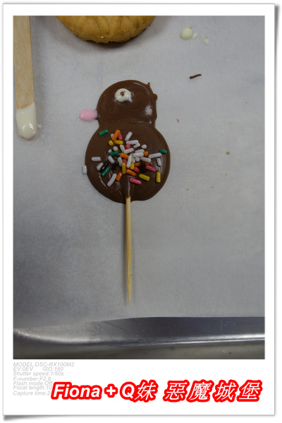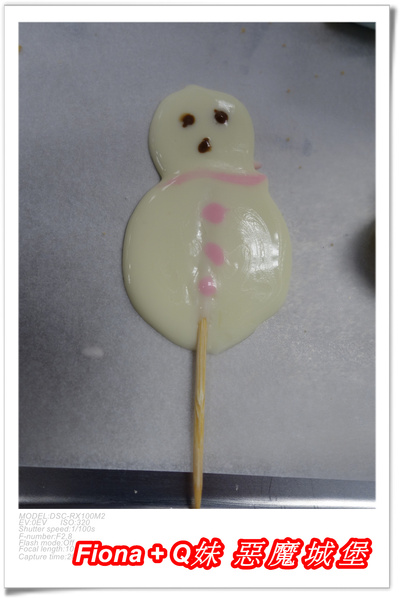 老師教我們將巧克力利用牙籤畫出鴨子棒棒糖,除了鴨子外,Fiona還自創了雪人棒棒糖,看起來挺可愛的哩 !