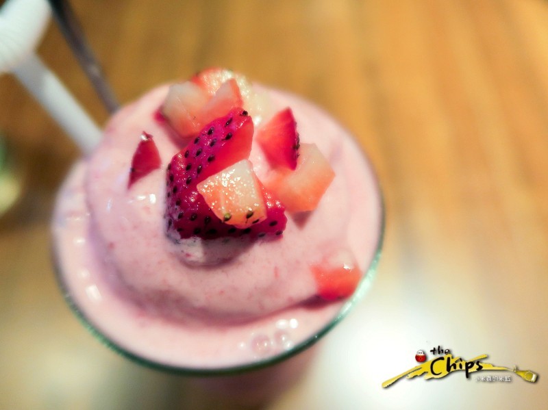酸酸甜甜的草莓冰沙還加有一球草莓冰淇淋,上面還放上了碎碎的草莓果粒
