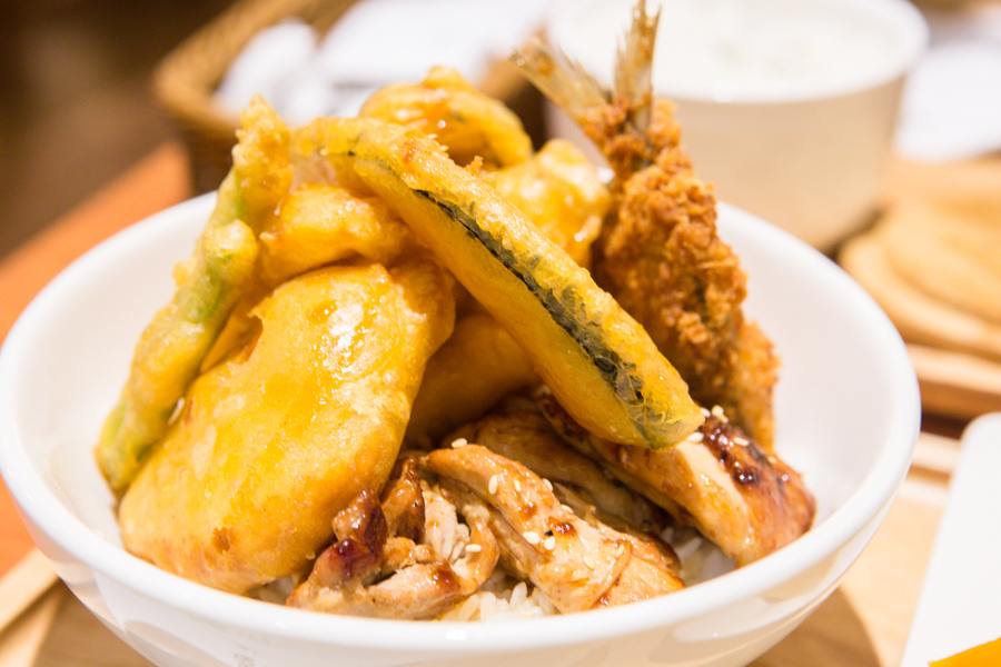 飯上面放著由竹莢魚、炭烤雞肉以及炸天婦羅堆成的小山
