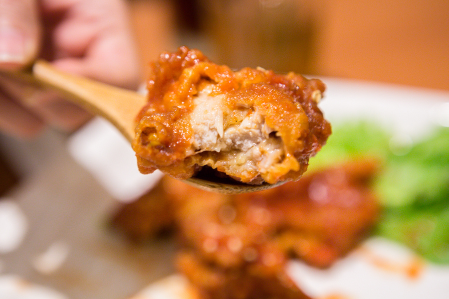 表層吃起來其實很像糖醋料理的感覺,但內部雞肉吃起來就像炸雞一樣的嫩且多汁