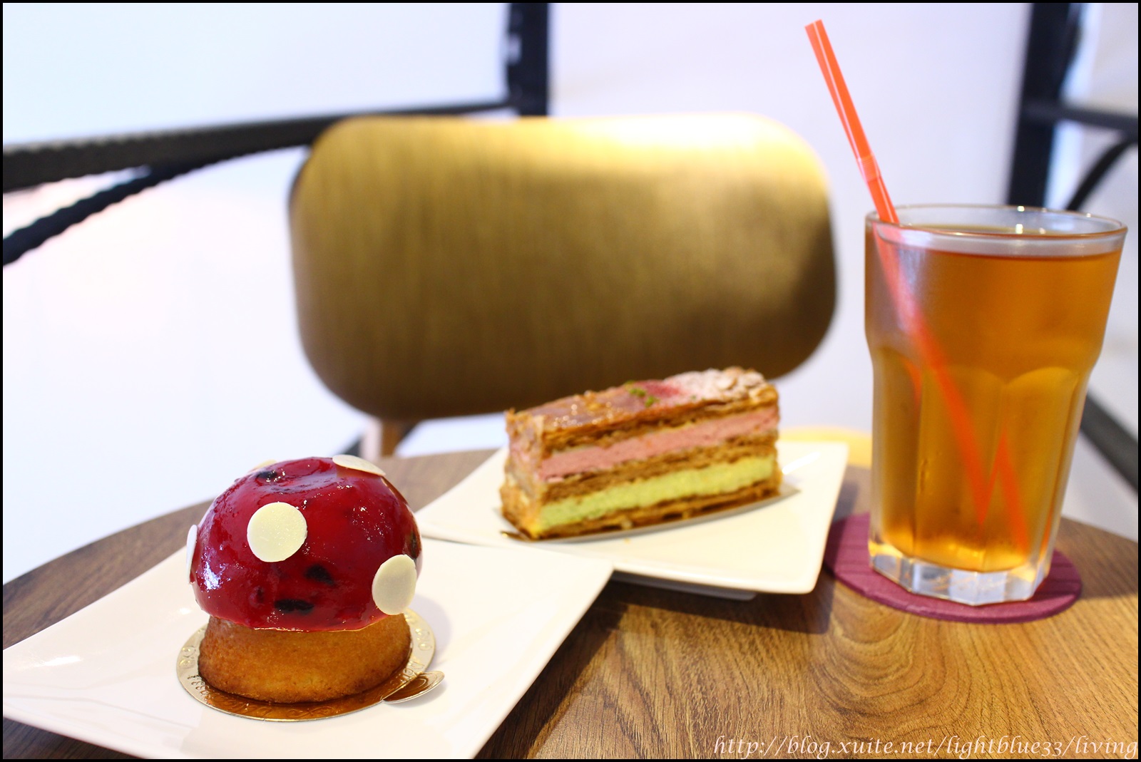 點了兩個甜點一杯飲料,內用免服務費。冰伯爵茶很香濃夠味才70元,甜點是蘑菇跟開心果覆盆子千層