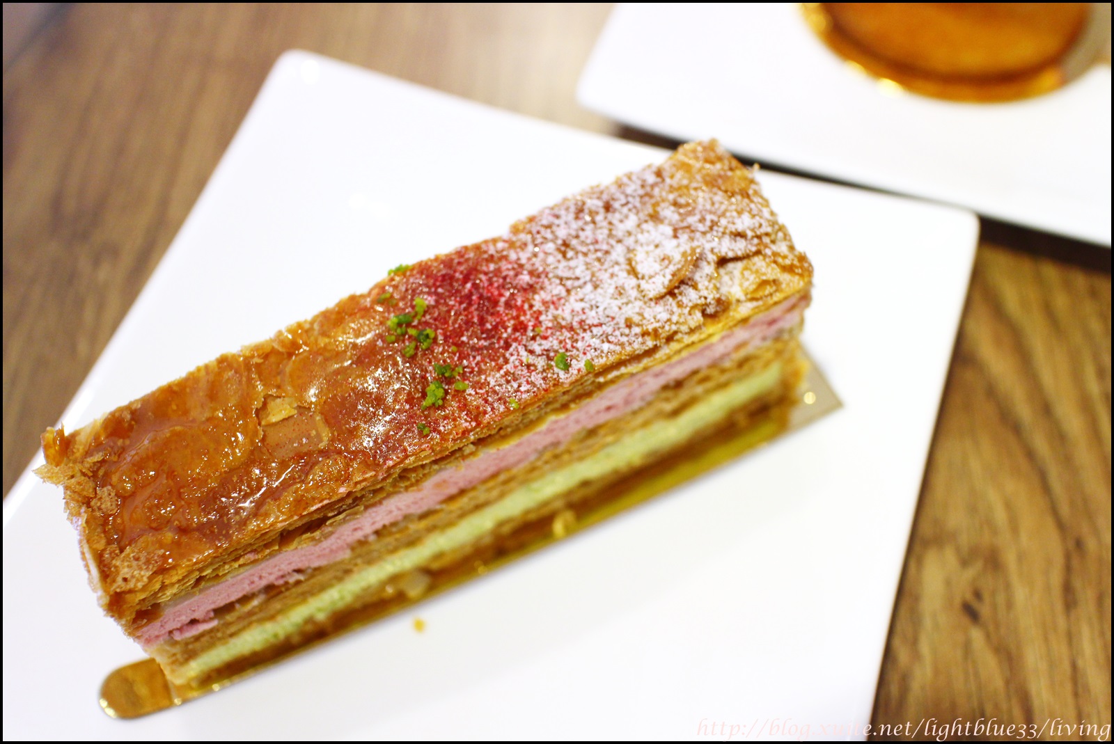 可以看到在千層與千層的酥皮之間,一層是覆盆子、一層是開心果,一紅一綠,味道上也是很有層次,覆盆子的果酸與開心果的核果香氣相輔相成,尤其是開心果因為成本很高,一般來講都只會給一點點,或者只撒在上頭當裝飾或點一下味道而已,葡萄麵包卻給了這麼厚一層,很有誠意啊!而且味道很濃,吃得出來用料很實在