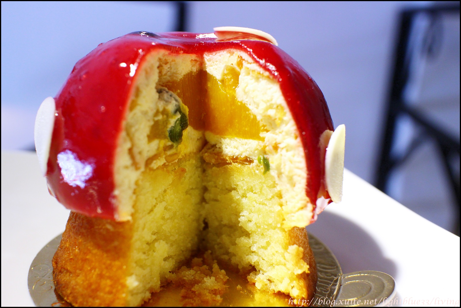 小心切開來,可以看到有芒果塊、杏仁餡跟綜合果乾,然後還有一整顆的開心果!