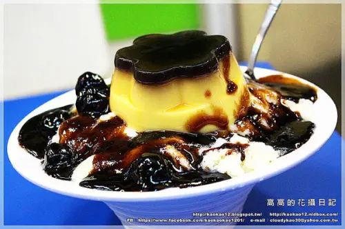 抹茶紅豆杏仁布丁雪花冰是抹茶雪花冰上頭放杏仁布丁、紅豆跟煉乳