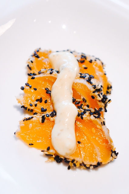 鮭魚外表有稍微炙燒,再用黑白芝麻跟蜂蜜芥末籽調配,蠻清爽的。