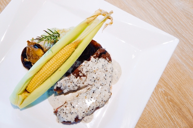 嫩煎紐約客佐新鮮蘑菇松露醬搭配馬鈴薯泥、玉米筍、節瓜,