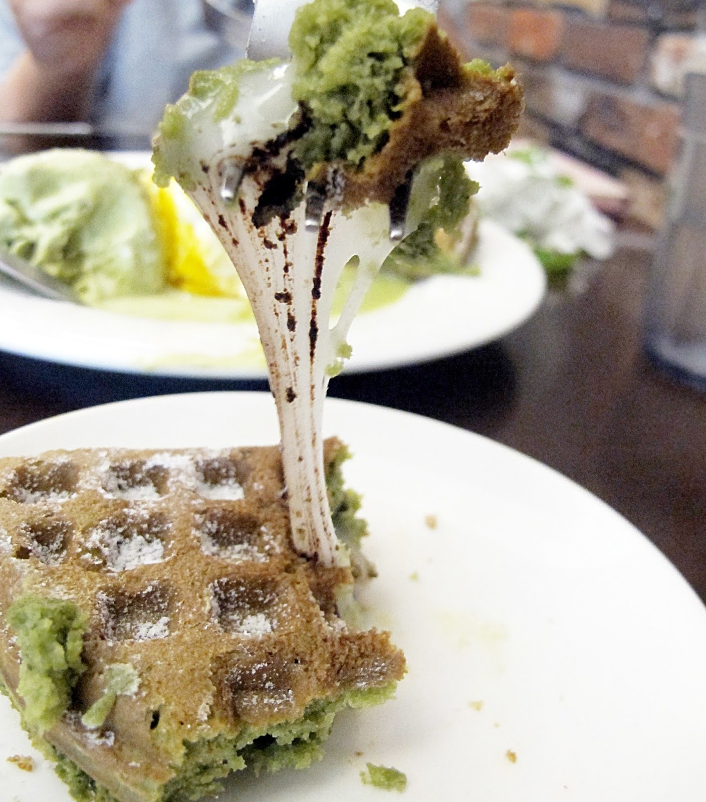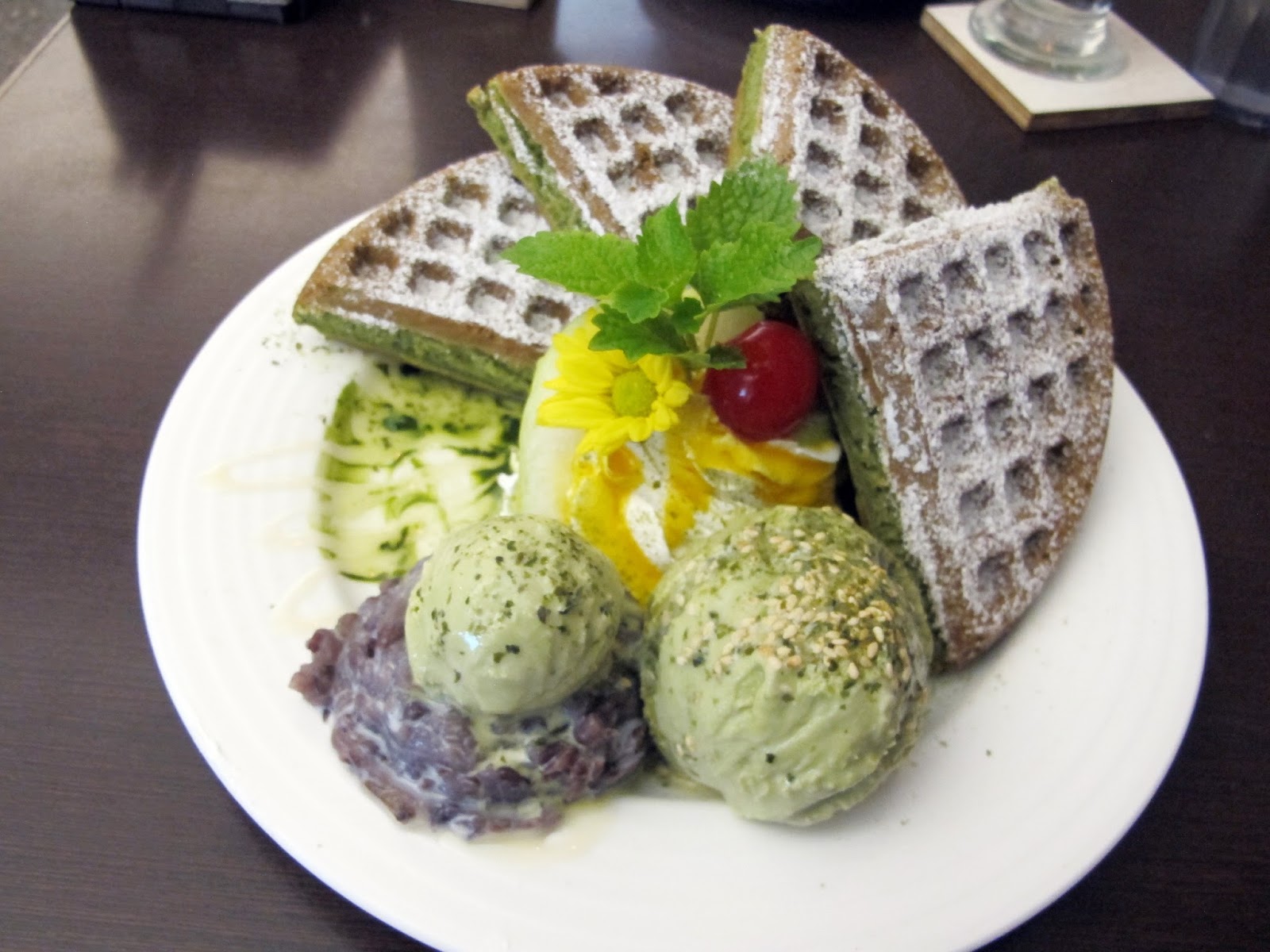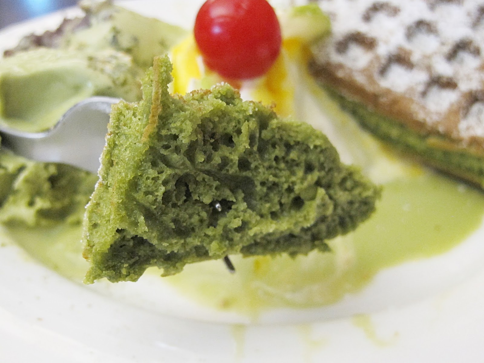 宇治金時<抹茶紅豆>鬆餅,抹茶鬆餅裡有著白玉麻糬、桂圓紅豆、明治抹茶冰淇淋