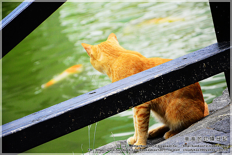 其中一隻小橘猛盯著池內肥碩的魚兒看,