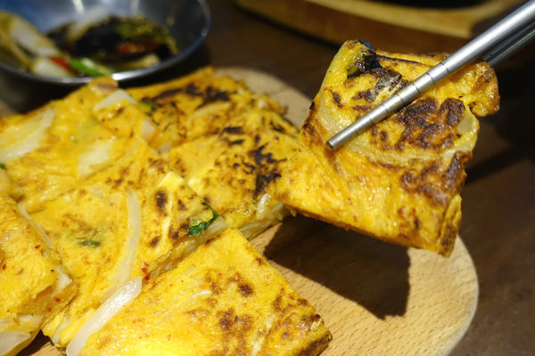 金黃無比的韓式煎餅有點像是玉子燒,表層被反覆煎到有點微恰微酥,