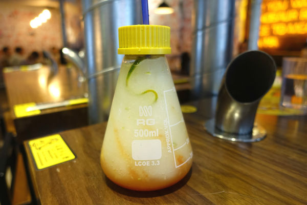 選用實驗三角錐瓶盛裝的冰涼氣泡飲料,很有衝突感