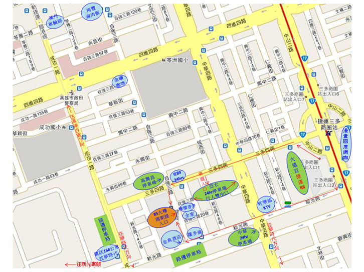 ➤2號出口人行道較寬,適合一大群人一起走,路程比1號多1分鐘左右,沒有電動手扶梯,但可以搭右手邊的電梯。 由2號出口就會在大遠百旁邊的路口(新光路)右轉,,朝著成高字型的85大樓方向直走約7分鐘, 過中華路後再走一下,在羅多倫咖啡的轉角右,入口就在全家的正對面,新光銀行的標誌處。