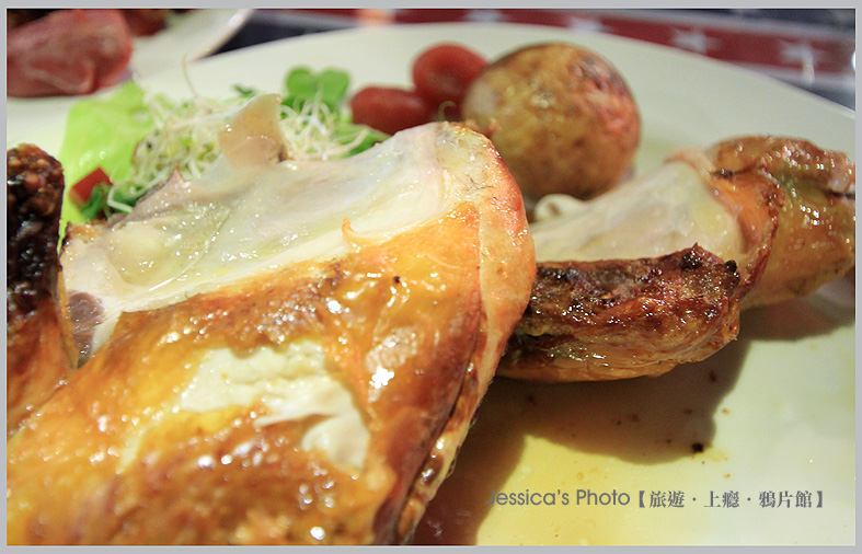 下圖是另一道餐桌上的風景"香料烤半雞",與其它餐廳很不一樣的是,主要以台式口味為主,經過老闆多次調整口味,發現還是這味道最受歡迎,類似甕仔雞的口感。