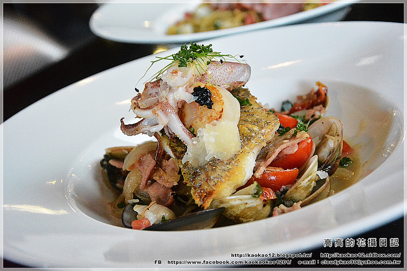 使用的海鮮有一大塊煎烤鱸魚、干貝、小卷、很多的蛤蜊,
