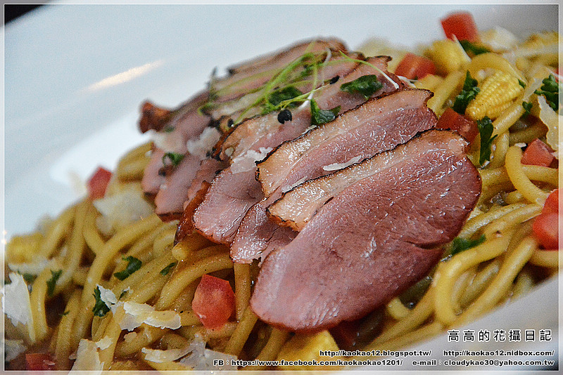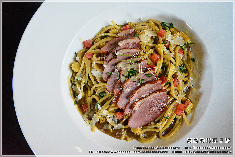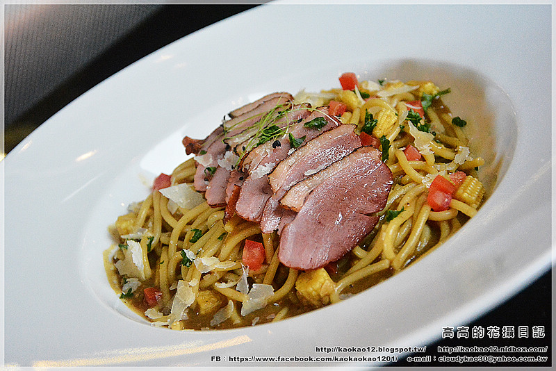 我點的主餐是『煙燻鴨胸搭配微辣咖哩醬汁鮮蔬義大利麵』。