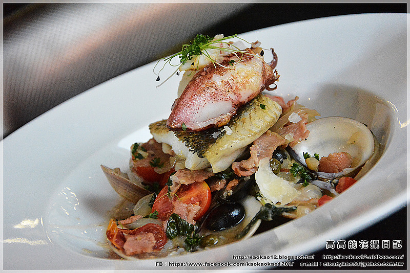 及『爆炒酸豆、風乾蕃茄、鯷魚、橄欖、蛤蜊天使細麵搭配煎烤鮮魚干貝(620+10%)』。