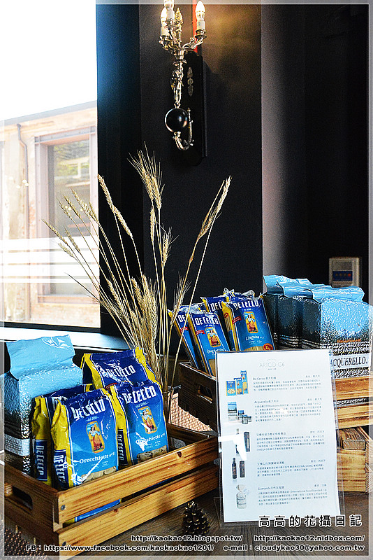 靠近結帳櫃台處有一小餐檯上擺放了餐廳所使用的義大利麵及義大利米,
