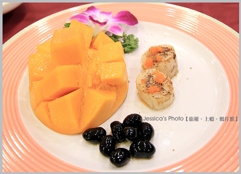 下圖,明太子干貝,搭配當季水果,海鮮跟水果也挺搭的,清新的果香氣,提襯了海鮮的香氣。