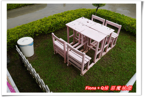 每一間小木屋前方都有一個小庭院,庭院裡放了粉紅色的小木頭桌椅,整個搭配起來充滿了有趣的童話風,大人可以坐在這泡茶聊天,小朋友則可以在一旁奔跑玩樂,一家人一起享受著悠閒的快樂時光,真是美好哩 !