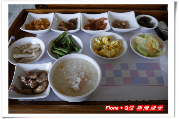 起床盥洗過後,到餐廳享用早餐,早餐是一人一份的中式餐點,有稀飯、肉鬆、醬菜、花生、高麗菜、玉米炒蛋、黑胡椒牛柳等,低油低鹽,吃起來非常健康,只不過我們很少早餐吃中式的,所以實在不太習慣啦 !