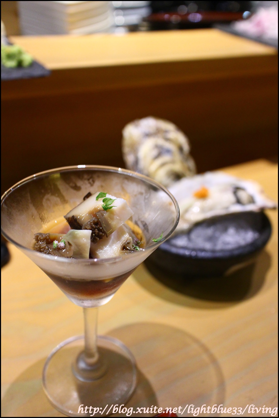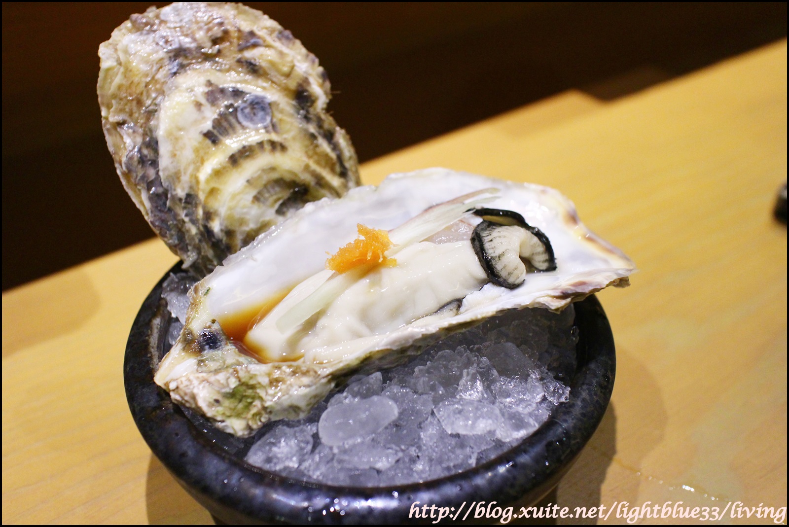 登登!3000元套餐的生蠔出現啦!匠壽司採用日本厚岸產的生蠔,只簡單以醋和蘿蔔泥調味,還搭配茗荷(日本生薑),吃起來是舒服的海味,完全感覺一絲腥味,口感則是令我驚奇的印象深刻,因為牠並非像蚵仔那樣軟軟的,反而接近干貝那樣的彈性,所以這麼大一顆入口並不會覺得噁心,茗荷的脆口也同時達到了口感的平衡,非常具有畫龍點睛之妙!