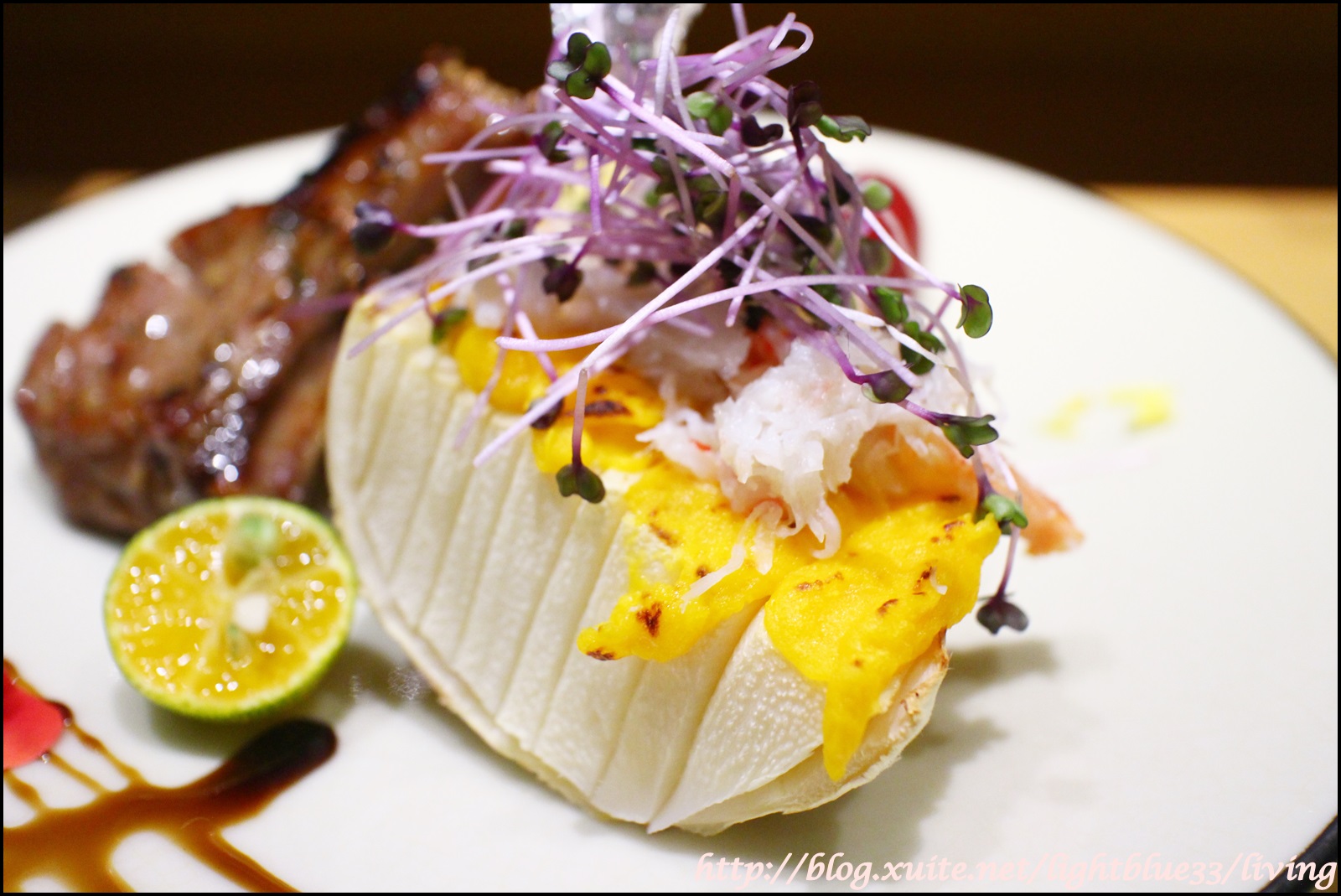 上頭的松葉蟹和紫高麗菜苗是低調的奢華,即使沒有再多加調味,卻一點兒也不失色