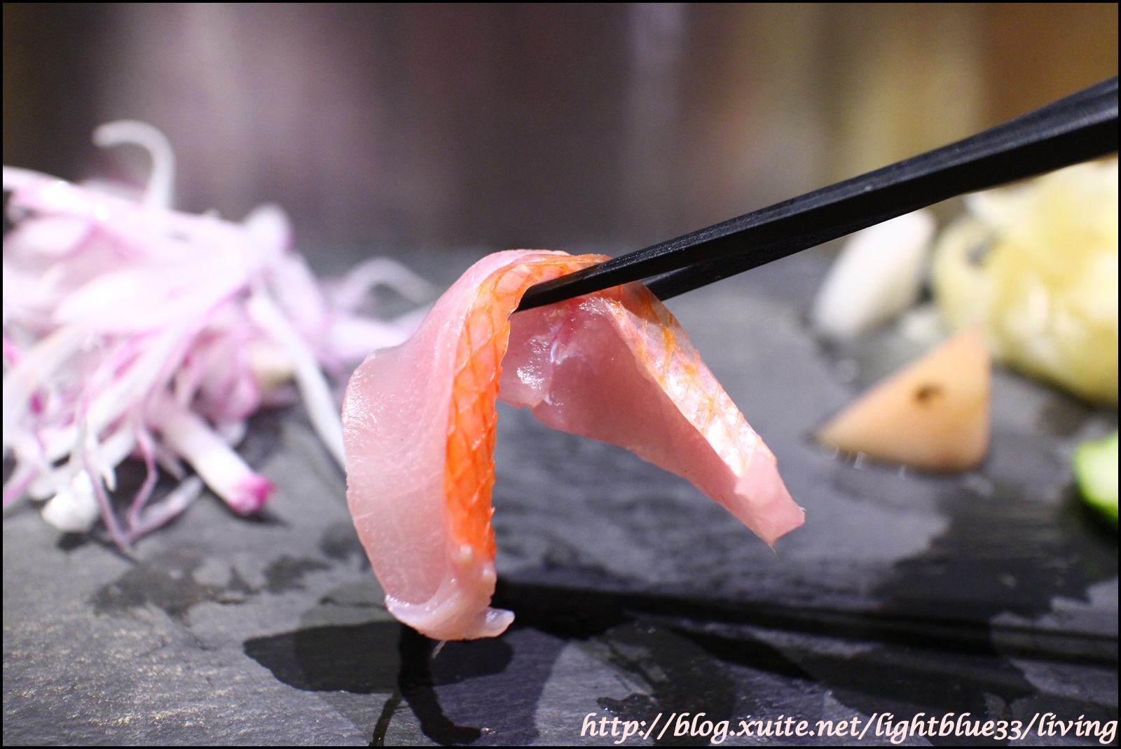 接著是一連串的生魚片(兩種套餐內容相同),這是真鯛,師傅給我們一塊背、一塊腹肉,腹肉吃起來會比背部多一點點的油脂,不過因為分佈均勻,所以還是清爽脆口的,也因為這是第一片生魚片,本來生魚片的品嚐順序就要先由油脂較少、白肉魚片先食用,油脂較豐富或味道較重的為後,這樣可以讓我們清楚感受到不同魚種的特質,也讓舌頭做好迎接重口味主菜的準備。