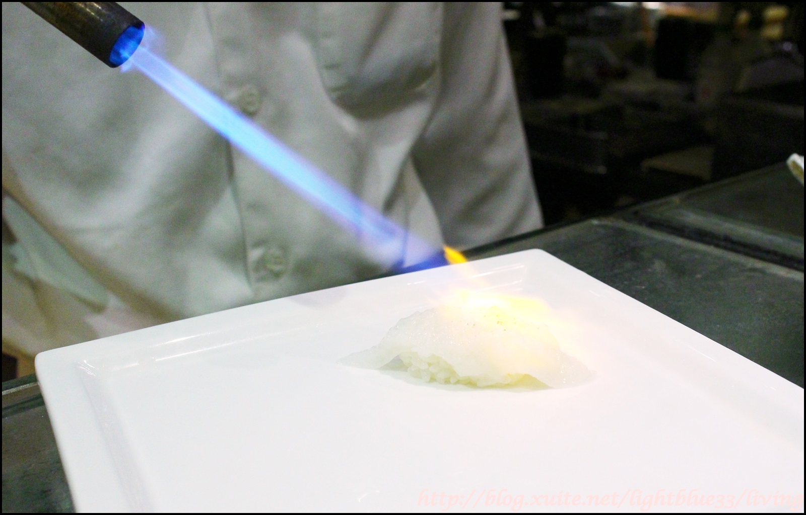 低調的師傅又立即著手下一個動作,拿出了噴槍開始炙燒比目魚鰭邊肉