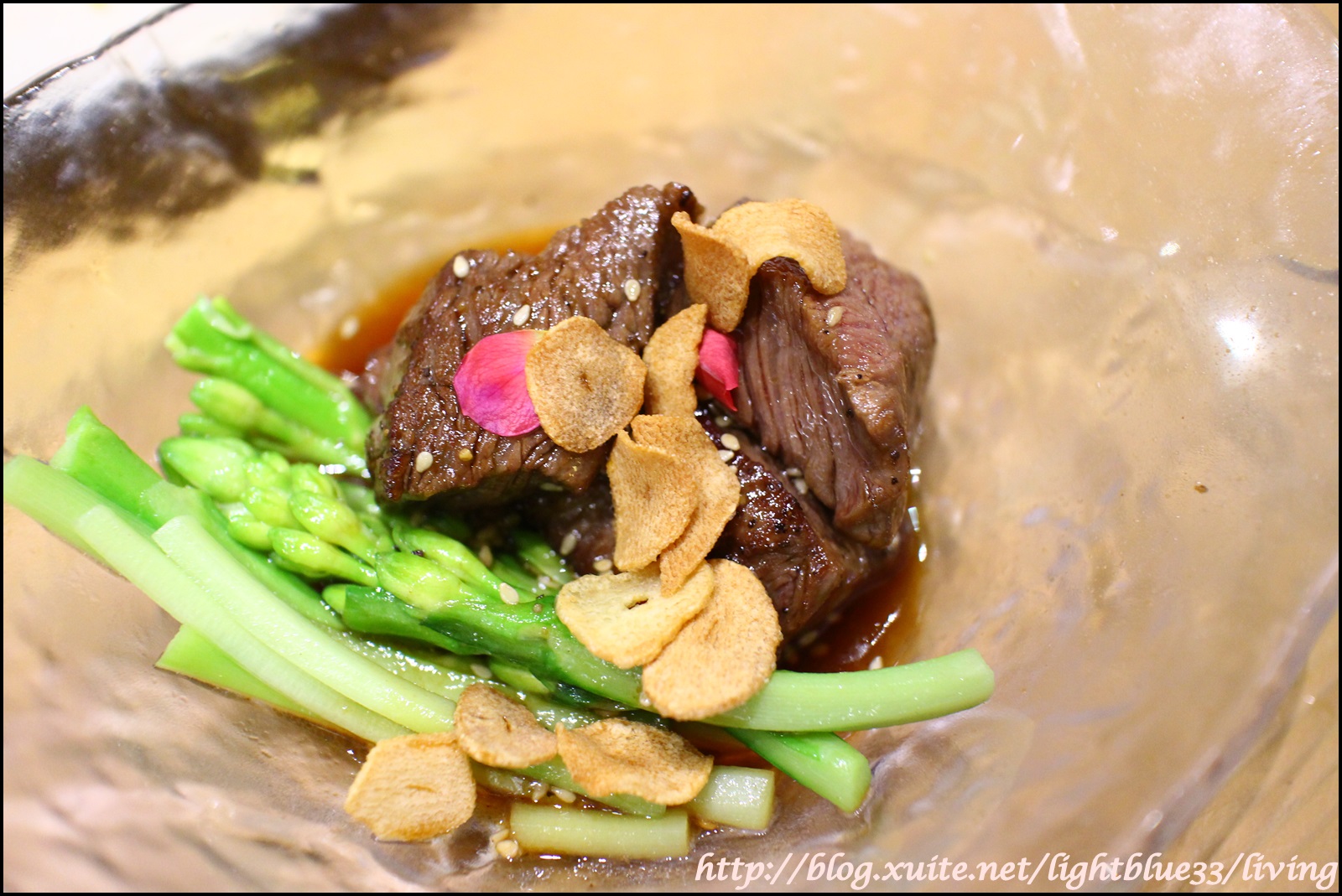 3000元套餐享用的是安格斯牛肉佐晚香玉筍(又名夜來香花包),綠色的可不是蘆筍,而是一斤要價六、七百元的晚香玉筍,吃起來纖維的口感比蘆筍更明顯一些,可是風味特出完全不輸牛肉,因為也有醬汁,沾著一起吃就不用擔心會有草味