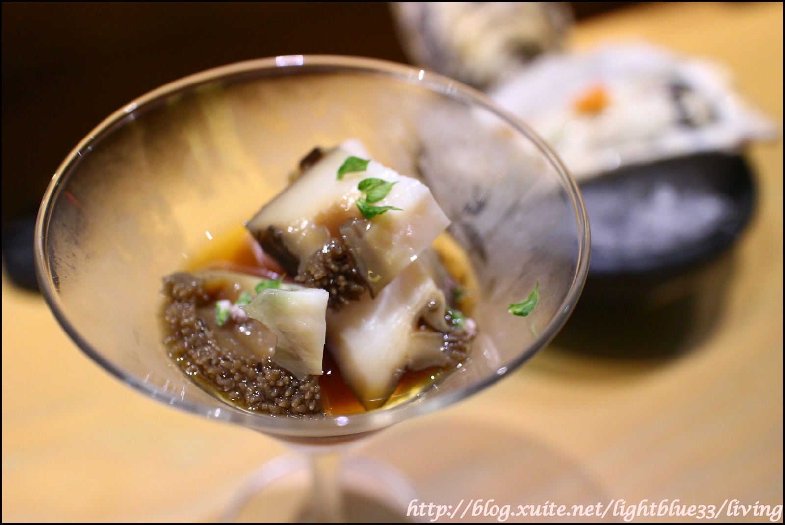 還在生蠔的震撼中,以酒杯盛裝的南菲白鮑又來一擊!這是店家以活鮑魚下去滷的,這樣才能讓鮑魚吃起來具有爽口的彈性,連底下的白蘿蔔也完全吸收了甜甜鹹鹹的醬汁。