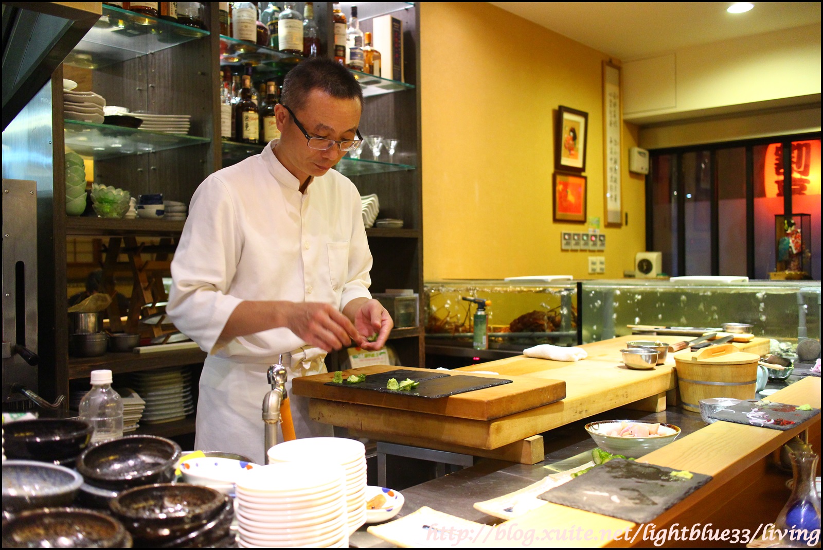因此,「割烹」會呈現出與一般日式料理大不相同的氣氛,雖然這不是我第一次吃無菜單料理,不過要踏進來前還是要小小做一下心裡準備,因為這次體驗的匠壽司門面就非常的日式低調,感覺如果沒帶夠錢是不敢走進去的那種XD 然而,當我推開門,除了熱情招呼聲之外,就座後馬上就可以觀察到板前的客人和師傅此起彼落的輕鬆聊天狀況,讓我的緊張退去了不少。這位便是主廚阿治師傅,一整個晚上聽他講食材跟料理,看他展現的手藝跟風範,讓我獲益匪淺,日本料理的世界好博大精深,我要學的還有好多啊!