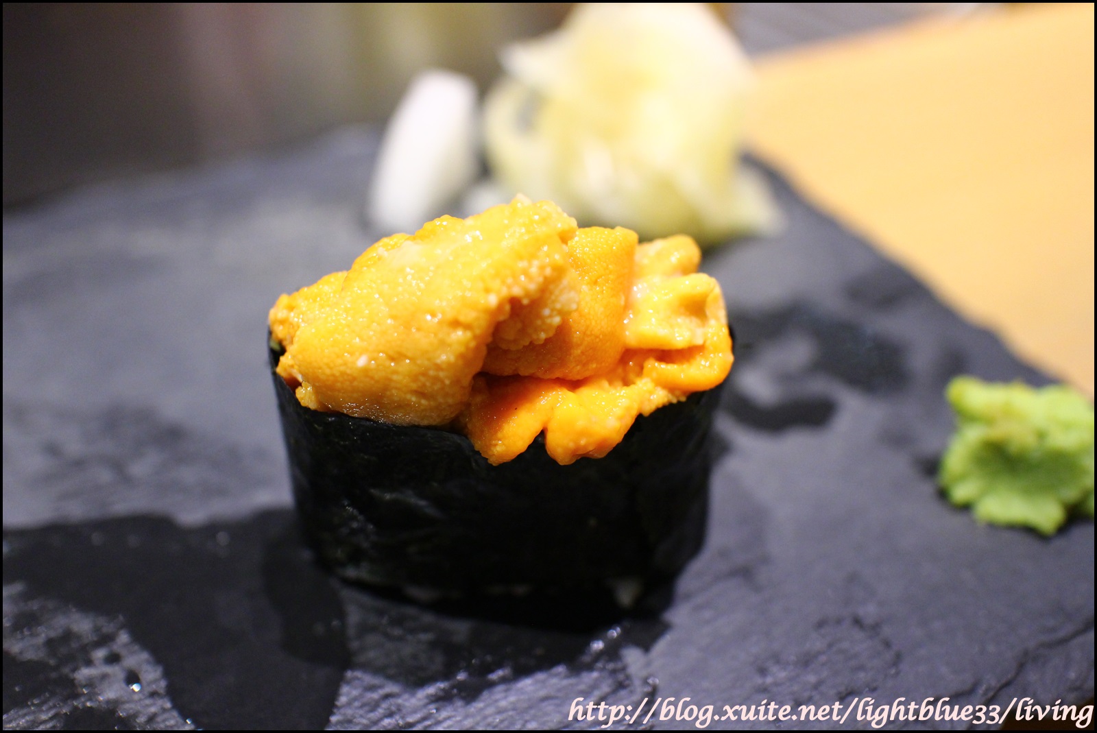 這時候師傅竟然還沒有要結束的意思,又端出海膽壽司來!不同價位的套餐,師傅還採用不同等級的海膽呢,這是2000元套餐的利尻海膽,當然也有一定水準,可是跟3000元套餐的海膽相比吃起來口感比較黏,味道也重一點